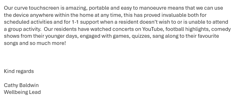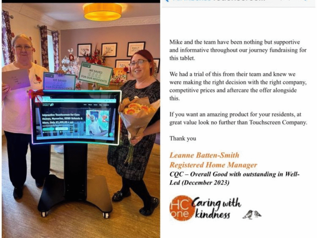 We purchased an interactive touchscreen Oct 2021 at a price of £4740.00 from one of the main resellers of these products based in Shropshire. The interactive touchscreen has been faulty for the 2 months and would not switch on. I contacted the company and was informed that parts to repair are no longer available, I was given different options, including purchasing a new touchscreen from them at a cost of over £6000.00 plus VAT, an engineer visiting at a cost of £1.00 a mile, to see if they could repair, a visit by an engineer at a cost of £180.00 with their new interactive touchscreen to demonstrate and the option of the engineer looking at the current unit while here. On the same day I had spoken with the company by complete chance I received an email from www.Touchscreencompany.com (http://www.touchscreencompany.com/) offering their unique Curved screen product at £2495+vat. I explained the situation and the owner travelled up to see me the next day, he explained that he would not only supply me a Touchscreen Company Curve at a third of the price I was quoted but he would also repair my current unit free of charge. He also agreed to extend the warranty to 5 years because of my previous experience. Care Homes need support with costs at this time and www.touchscreencompany.com (http://www.touchscreencompany.com/) showed that they not only saved me £5000+vat on one purchase they showed they actually cared.