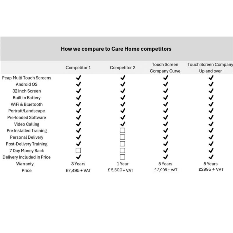 We purchased an interactive touchscreen Oct 2021 at a price of £4740.00 from one of the main resellers of these products based in Shropshire. The interactive touchscreen has been faulty for the 2 months and would not switch on. I contacted the company and was informed that parts to repair are no longer available, I was given different options, including purchasing a new touchscreen from them at a cost of over £6000.00 plus VAT, an engineer visiting at a cost of £1.00 a mile, to see if they could repair, a visit by an engineer at a cost of £180.00 with their new interactive touchscreen to demonstrate and the option of the engineer looking at the current unit while here. On the same day I had spoken with the company by complete chance I received an email from www.Touchscreencompany.com (https://www.touchscreencompany.com/) offering their unique Curved screen product at £2495+vat. I explained the situation and the owner travelled up to see me the next day, he explained that he would not only supply me a Touchscreen Company Curve at a third of the price I was quoted but he would also repair my current unit free of charge. He also agreed to extend the warranty to 5 years because of my previous experience. Care Homes need support with costs at this time and www.touchscreencompany.com (https://www.touchscreencompany.com/) showed that they not only saved me £5000+vat on one purchase they showed they actually cared.